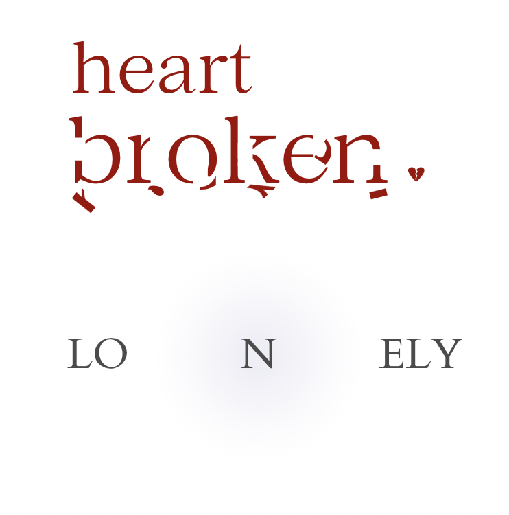 In the word “Heartbroken”, there are bits and pieces of the word broken that have broken off and fallen to the invisible ground. I chose this because in a heartbreak from a romantic love, it can often be a slow deterioration or pain caused over an extended period of time before there is a breakup.